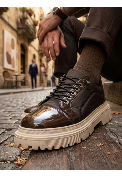 • AHN0332 Merdiven Desen Bağcıklı Erkek Yüksek Taban Siyah Cilt Siyah Taban Spor Ayakkabı