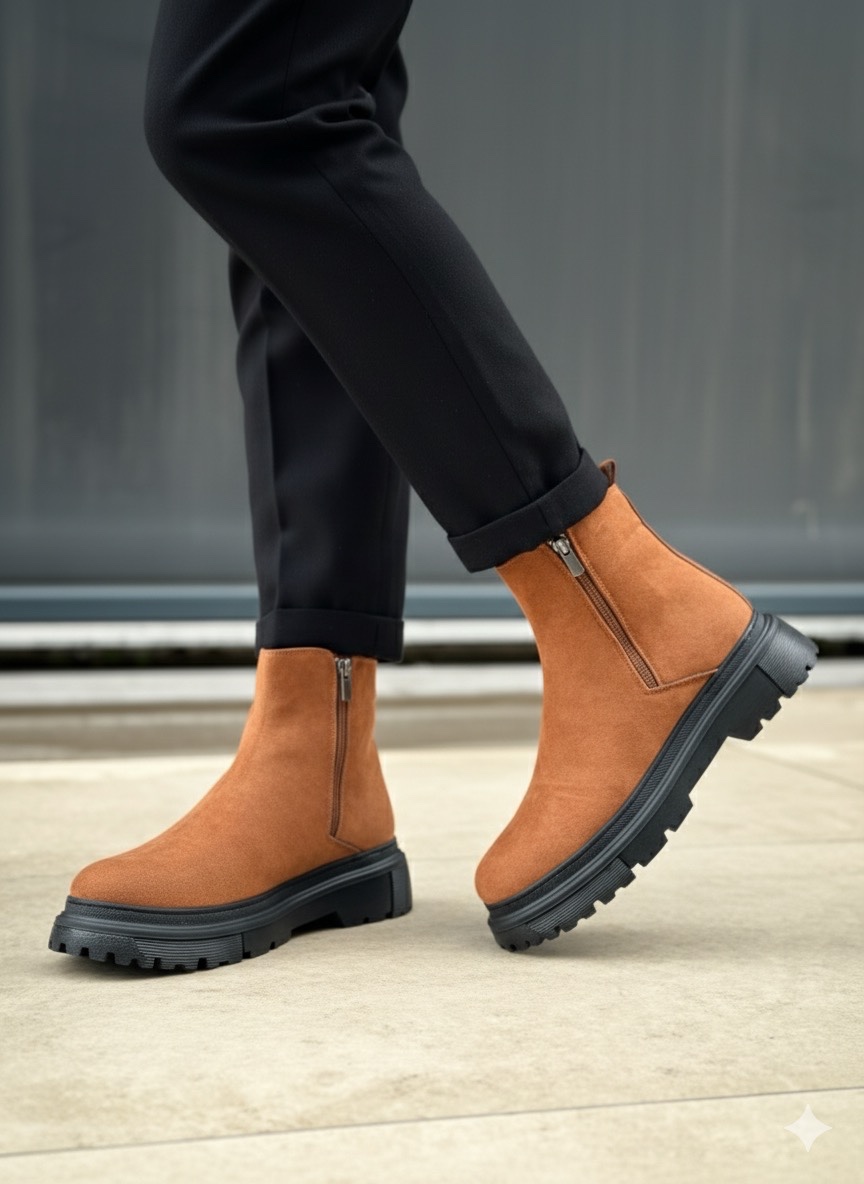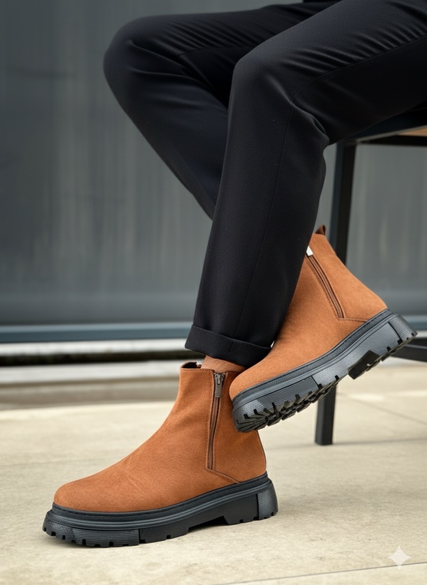 • AHN0777 Süet Taba Siyah Taban Çift Fermuarlı Erkek Yarım Bilek Bot