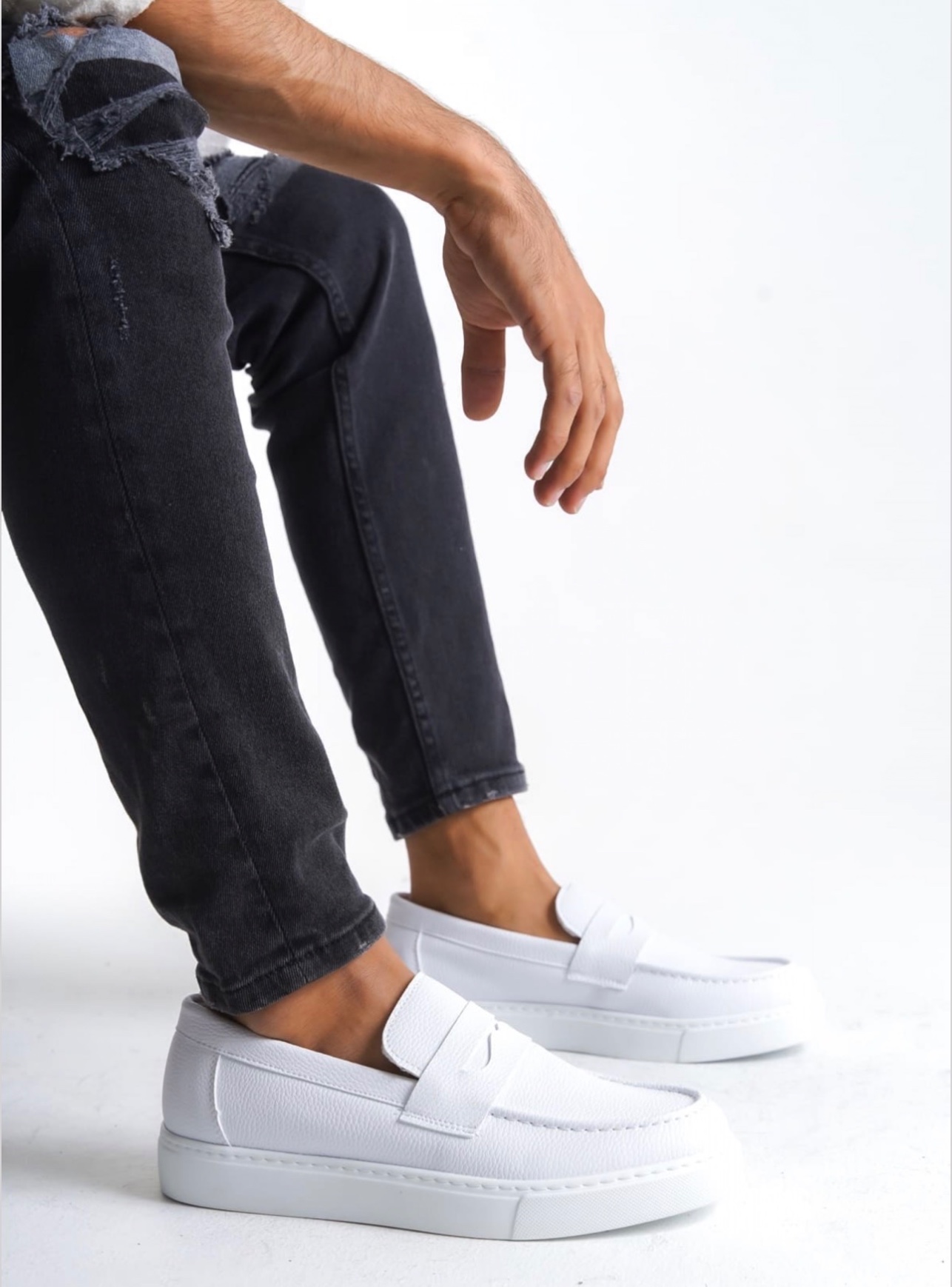 Tarz Erkek Ayakkabı Günlük Ayakkabı AHN0580 Bağcıksız Kuşaklı Yüksek Taban Beyaz Cilt Erkek Ayakkabı