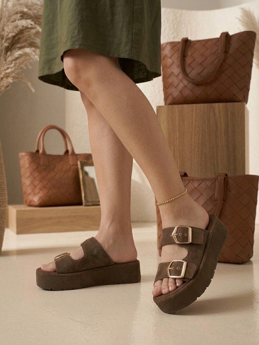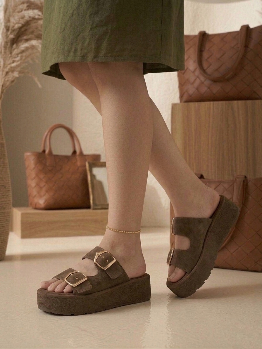 • Yazlık Kadın Kahverengi Platform Taban Tokalı Terlik